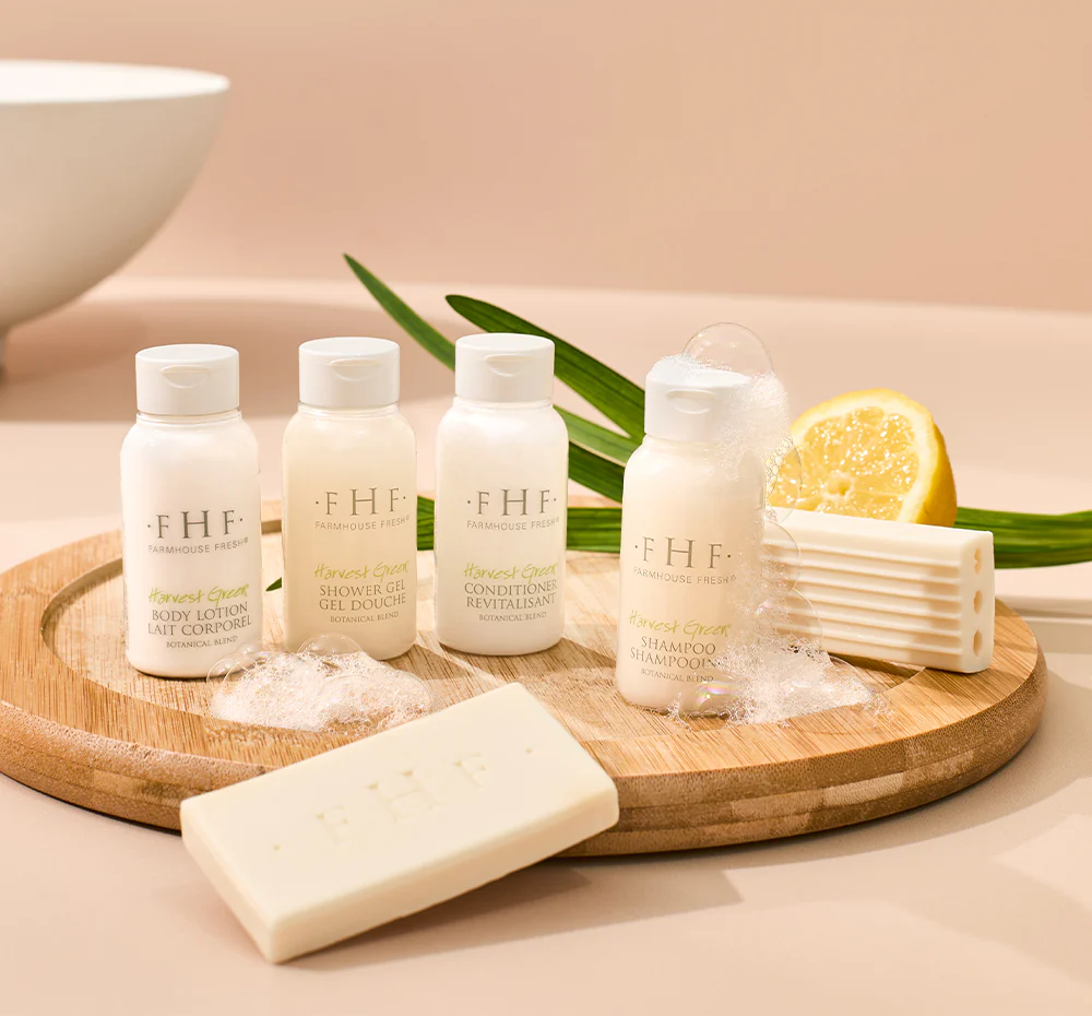 Whether you're jet-setting, road-tripping, or staycationing, take the spa experience with you! This hotel exclusive, 6-piece Harvest Green® Travel Amenity Kit brings our best-selling hotel collection straight to your carry-on. Each item features the beautiful, refreshing scent of fresh lemongrass and green melon, crafted with skin-loving ingredients like organic soybean oil, organic cucumber extract, aloe vera, and shea butter.